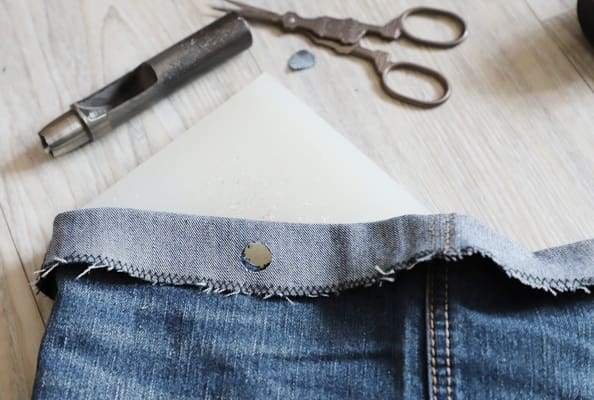 Torbanın üst kenarı, zikzak dikişli bir dikiş makinesinde işlenir. Kenarları sardık, delikler açtık ve halkaları (bloklar) taktık.