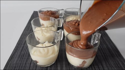 - Pişen muhallebiyi yarıya bölerek bir kısmına bitter çikolatayı ekleyip eriyene dek karıştırın. Daha sonra bir paket kremanın yarısını sade, yarısını çikolatalı muhallebiye ekleyip karışmasını sağlayın.